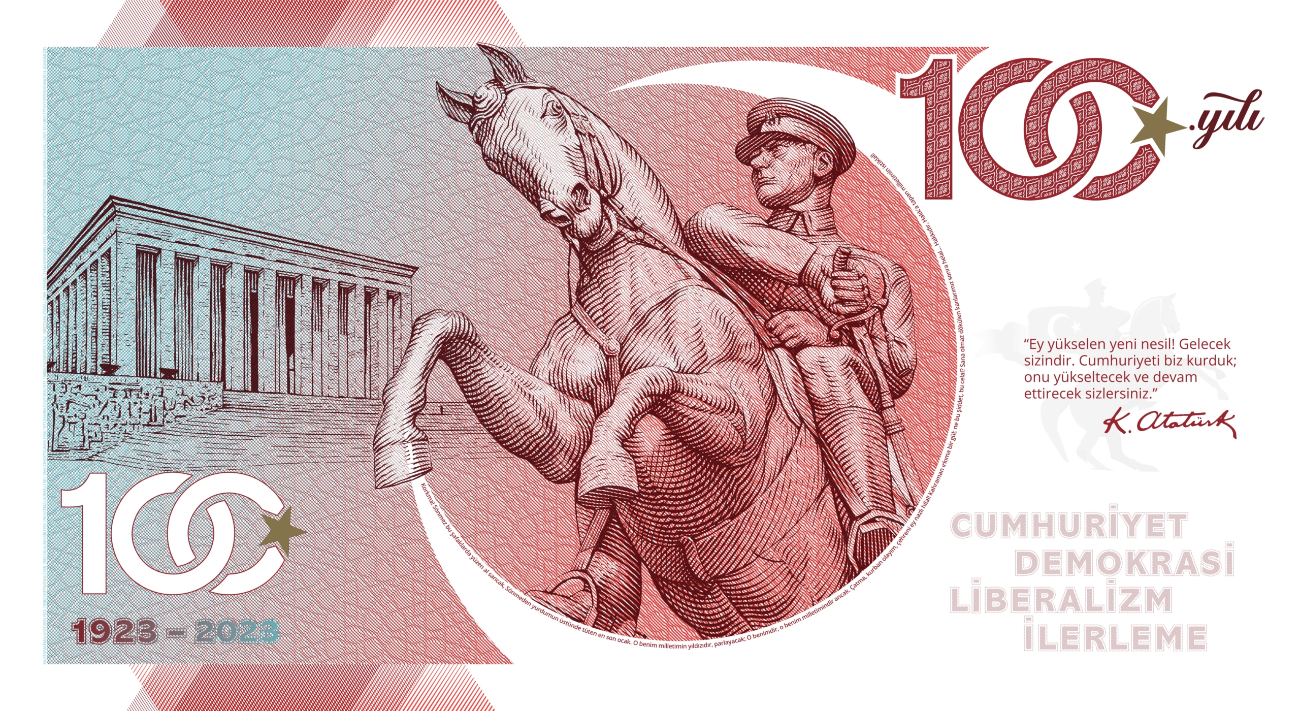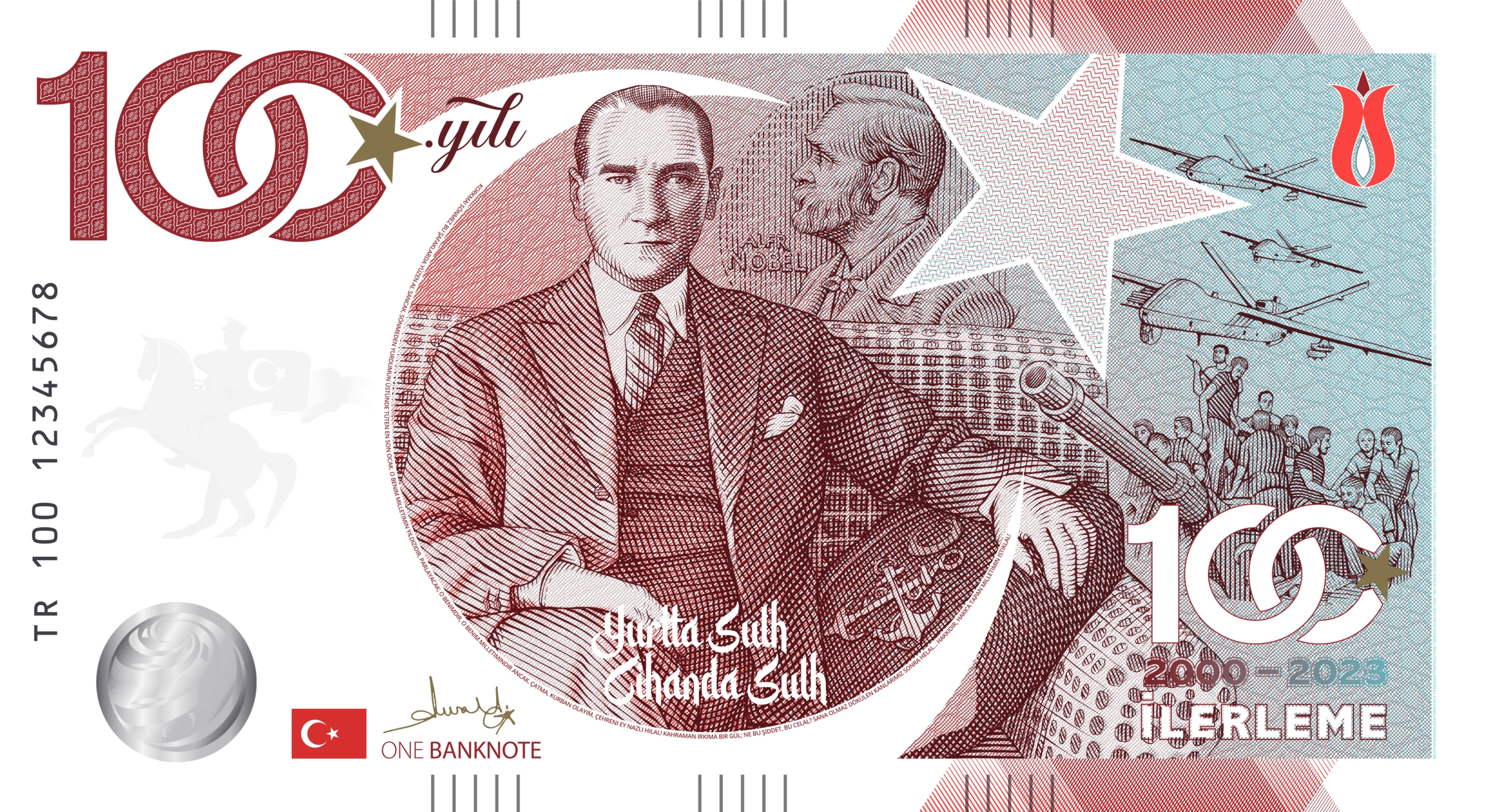 Türkiye Cumhuriyeti’nin 100. Yılı Hatıra Para Koleksiyonu’nun son yani “İlerleme” banknotu 2000-2023 yılları arasını temsil etmektedir. Dönemle ilgili ayrıntılı gravürlerin bulunduğu banknotun arka yüzünün merkezinde Mustafa Kemal Atatürk’ün takım elbiseli bir çizimi yer almaktadır. Ön yüzde ise Anıtkabir’in ve Atatürk’ün şaha kalkmış at üzerinde çizimleri yer almaktadır. Sağ üstteki lale detayı tamamen açmış ve olgunlaşmış bir laleyi yani ilerlemiş Cumhuriyet’i simgelemektedir. RJE daprhanesinde basılan banknotlar gerçek paraların sahip olduğu tüm kalite ve güvenlik özelliklerini barındırmaktadır. Sınırlı sayıda basılan ve koleksiyon değeri olan özgün bir banknottur.